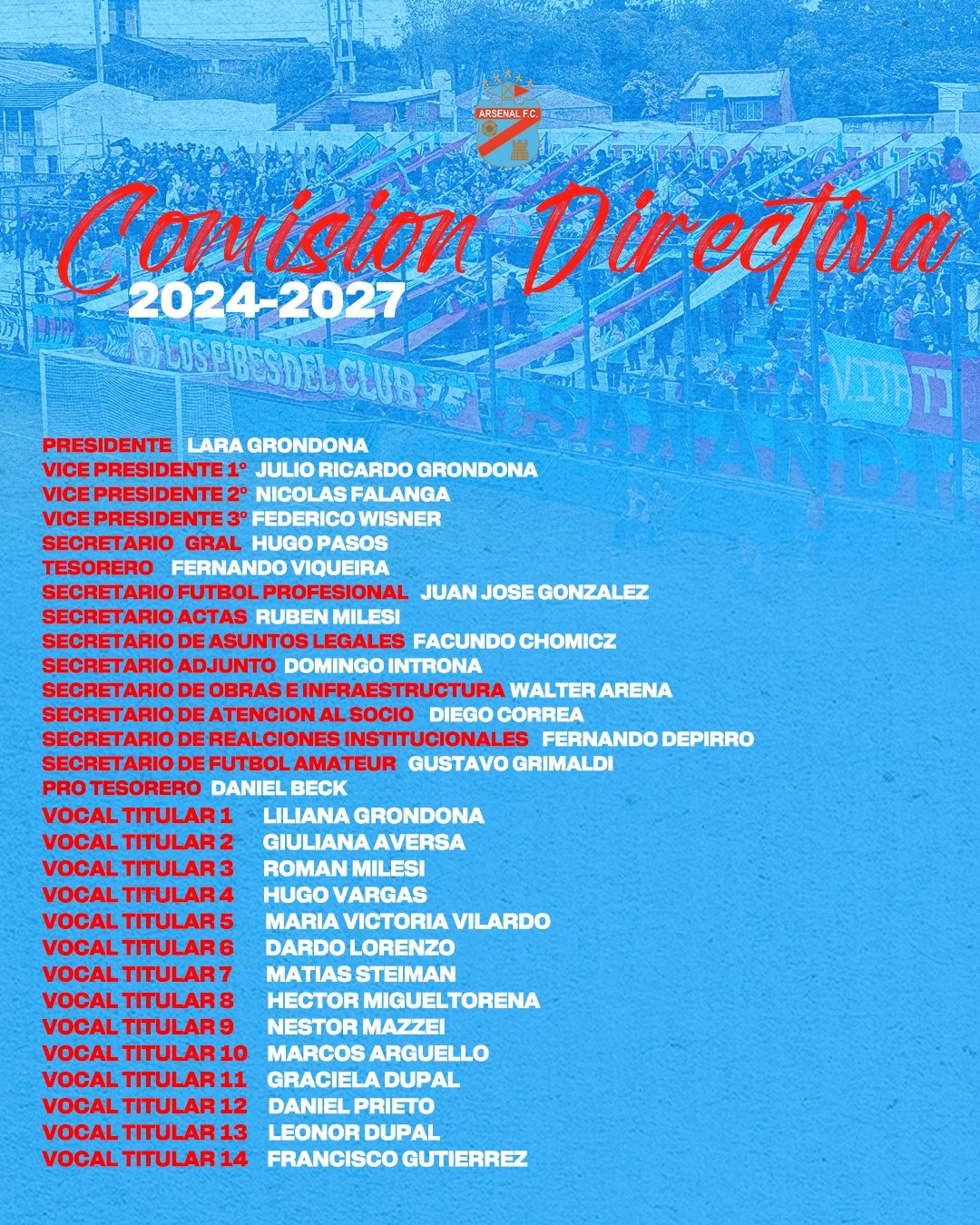 La nómina la encabeza Lara Grondona, hija del hasta entonces presidente del club Julio Ricardo Grondona -más conocido como ‘Julito’– y nieta del extinto expresidente de la AFA y fundador del Arse Julio Humberto Grondona, quien, de esta manera, asumirá la conducción de la institución.